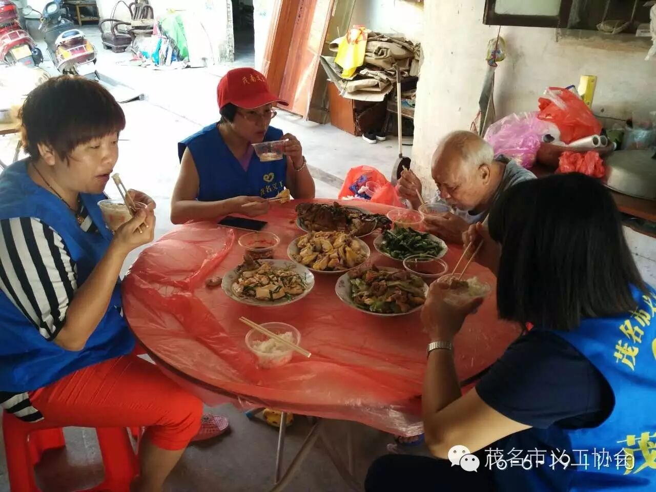 义工们煮好靓菜与柯伯一起吃