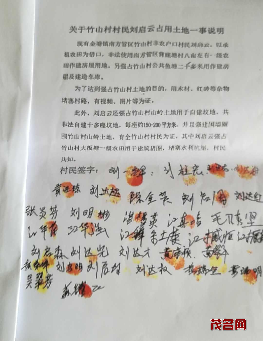 南方村委会竹山村是位于金塘中心镇,毗邻茂南工业区,经济发展占尽天时地利。但由于村中有二户,籍口在外,“有钱、有权”的:刘启云、刘启飞兄弟,随意回村中侵占村集体土地,(山岭、鱼塘、农田、村道)等,引起全村村民的无比愤怒!