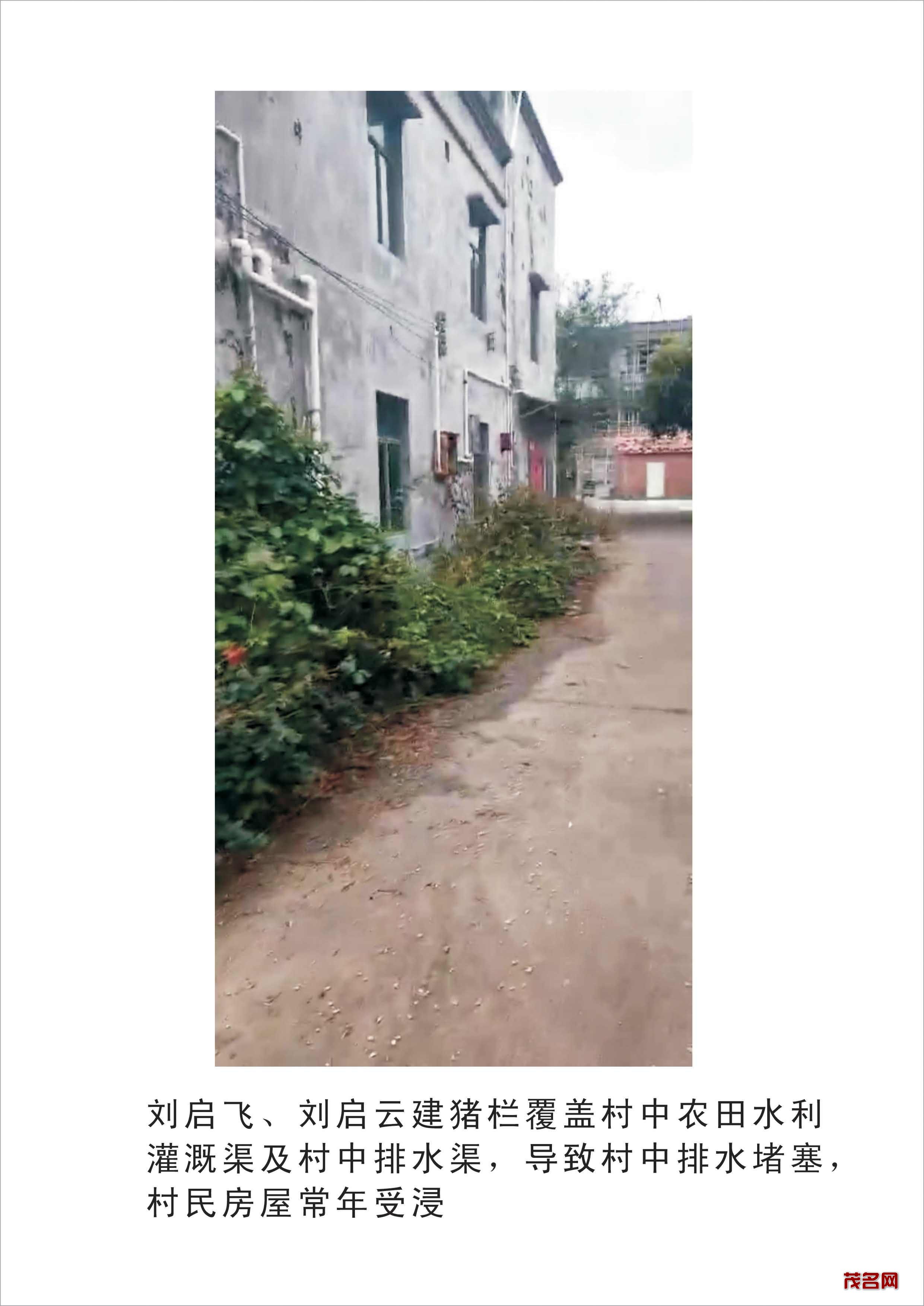 四、刘启云非法购买竹山村大板塘洞,一级农田约四亩建猪栏并把猪栏建成楼房,将农田灌溉水利全部覆盖,村中排水渠全部堵塞,下雨时无法排水村民房屋受浸。
