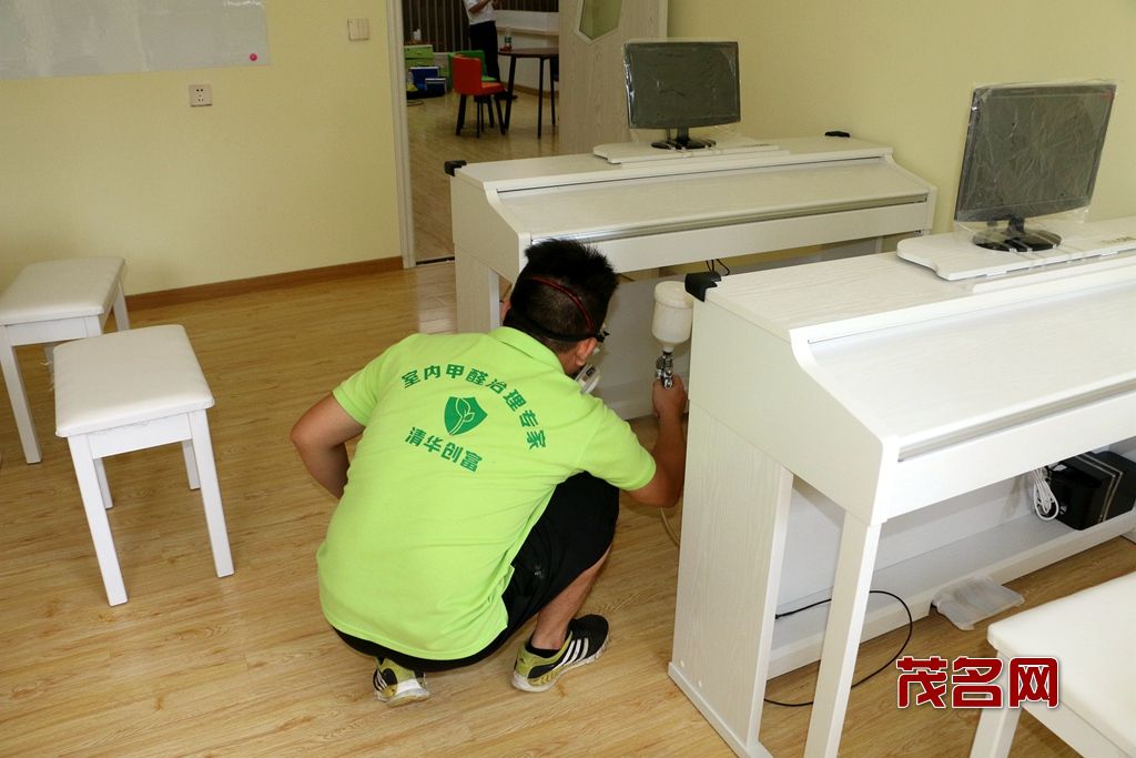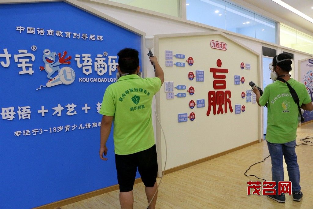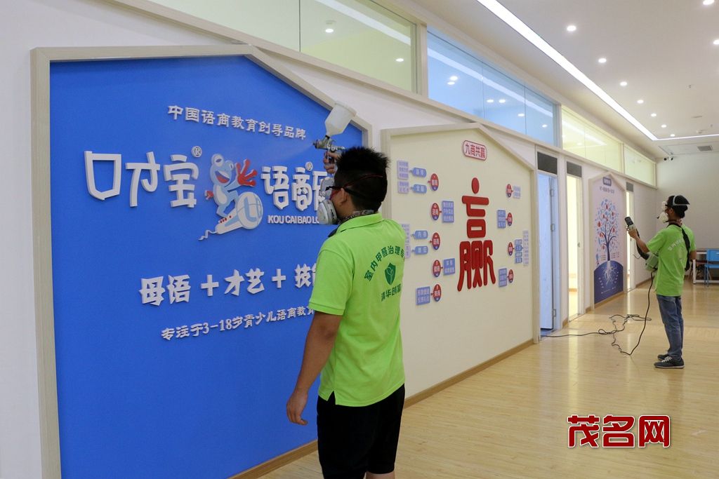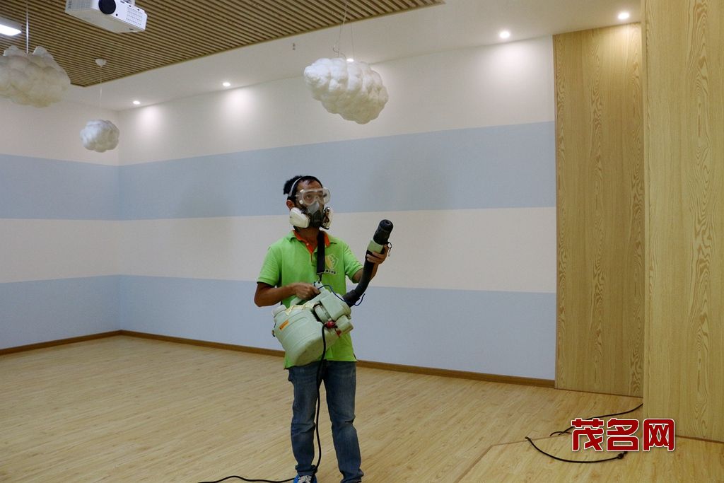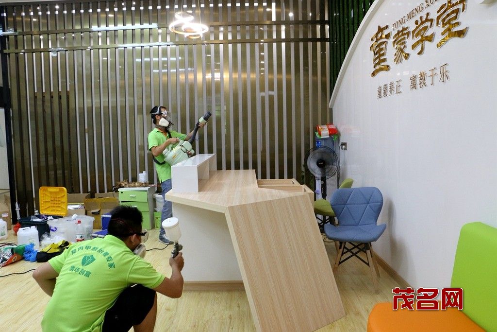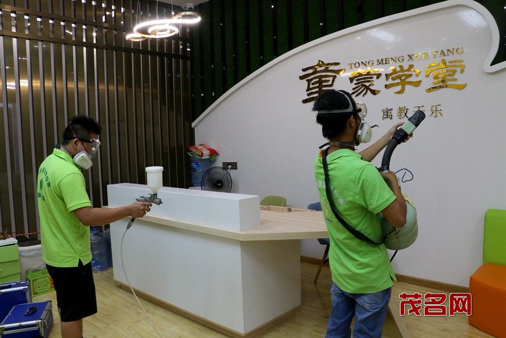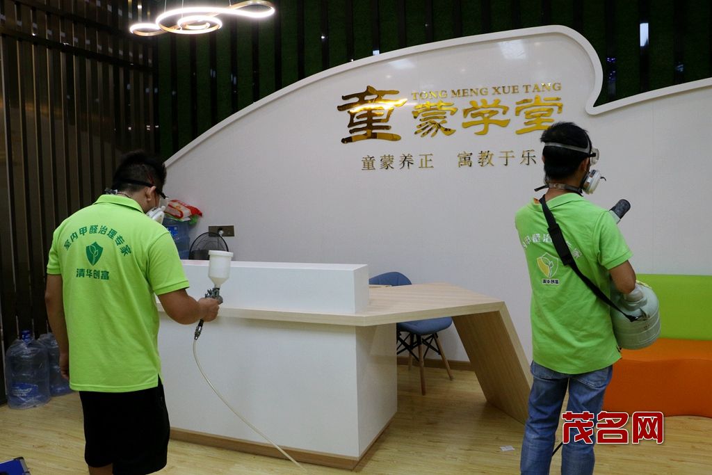 茂名市清华创富环保公司专业人员全副武装,应用目前先进的装备、技术和清除剂,针对茂名童蒙学堂的教室、教具、桌椅、走廊、画墙、天花等场所,进行地毯式除甲醛行动,将有可能危害少年儿童健康的甲醛等有害物全部清除。