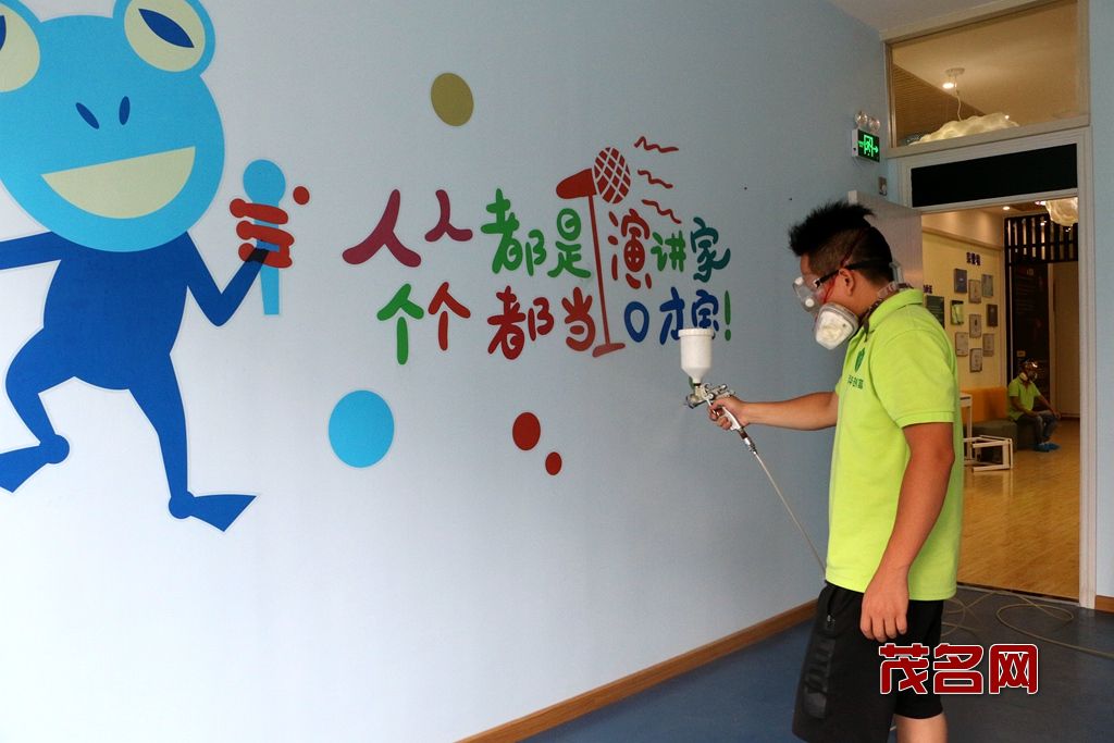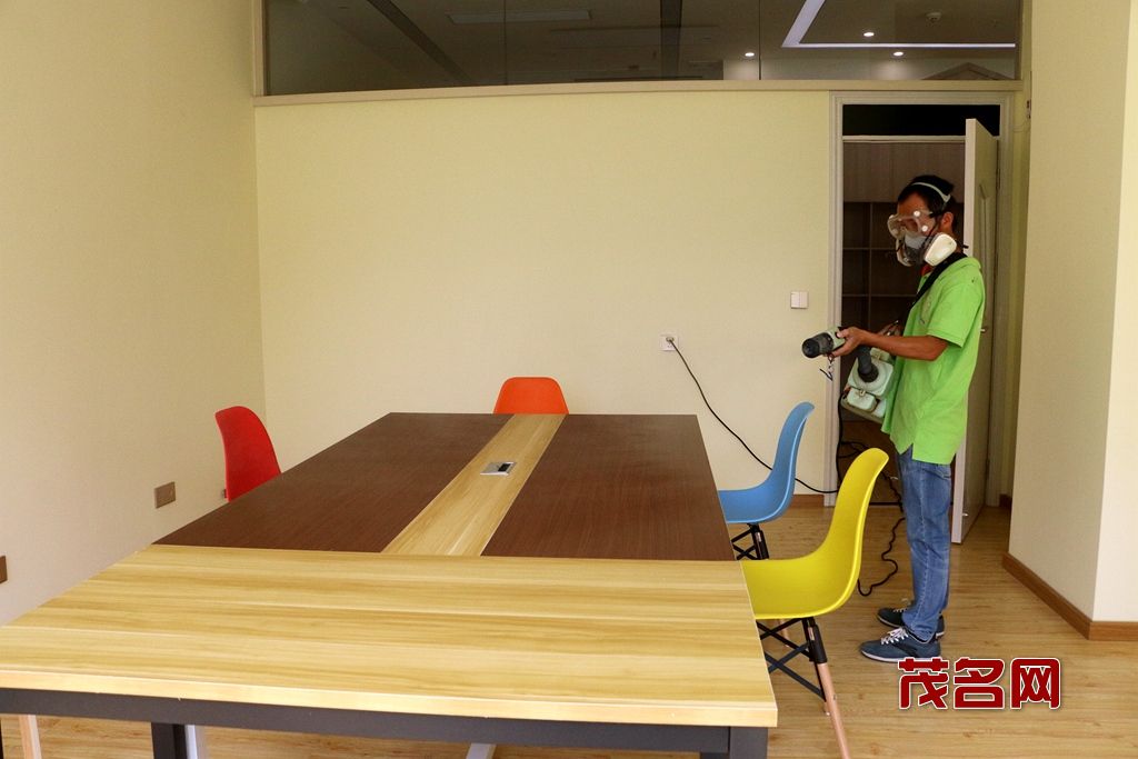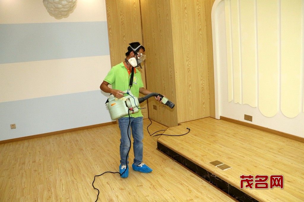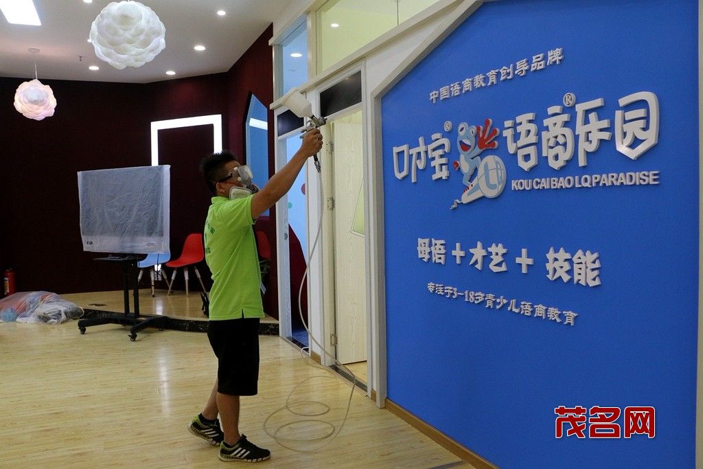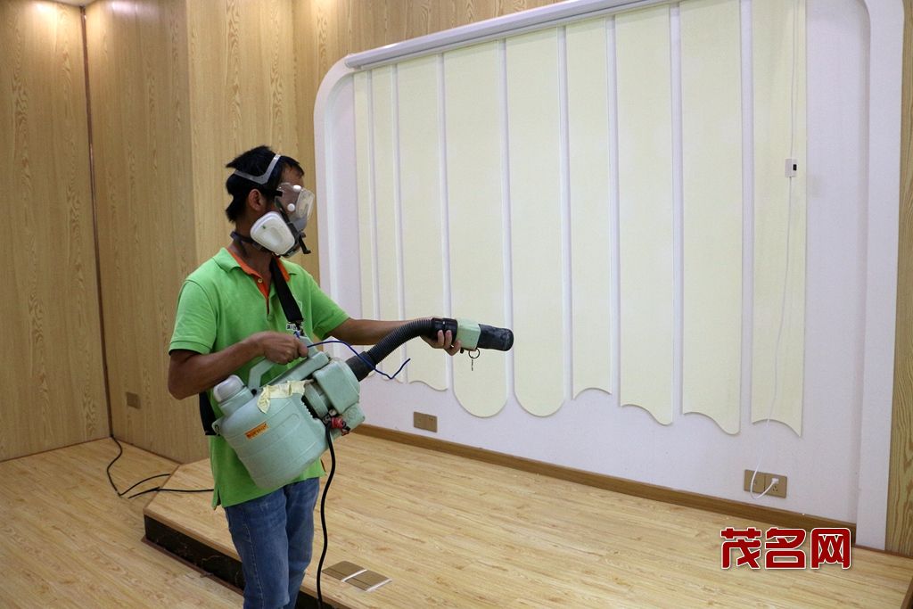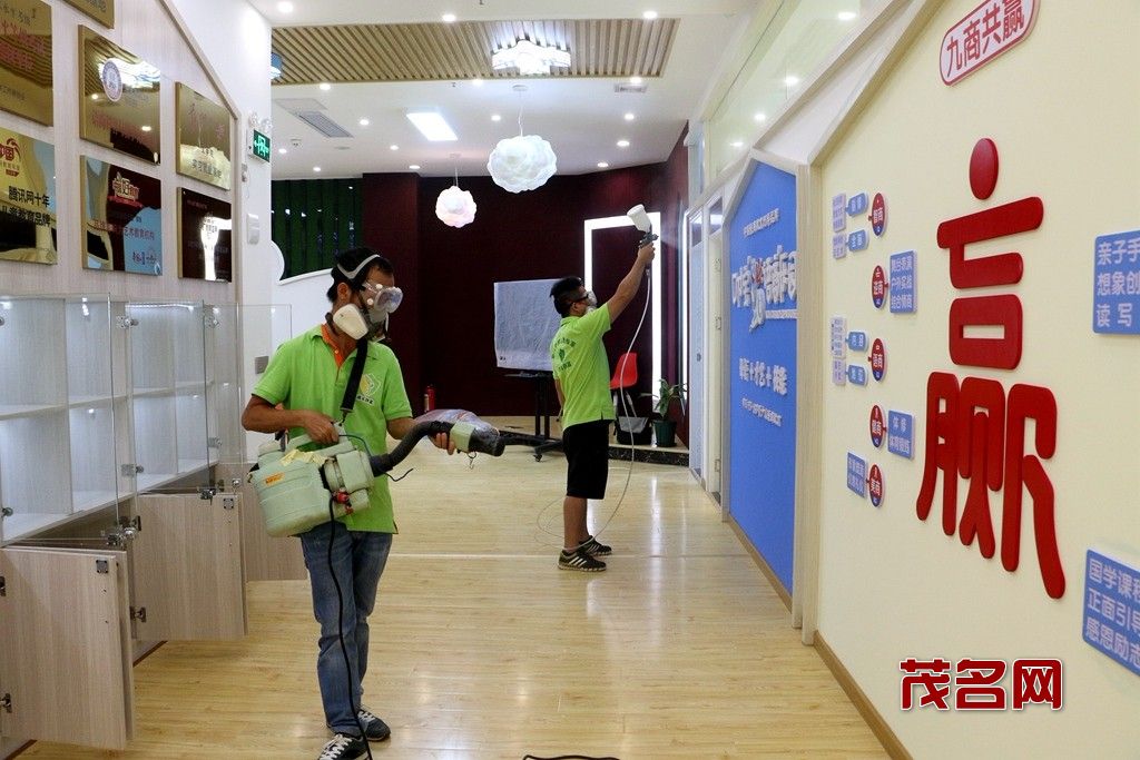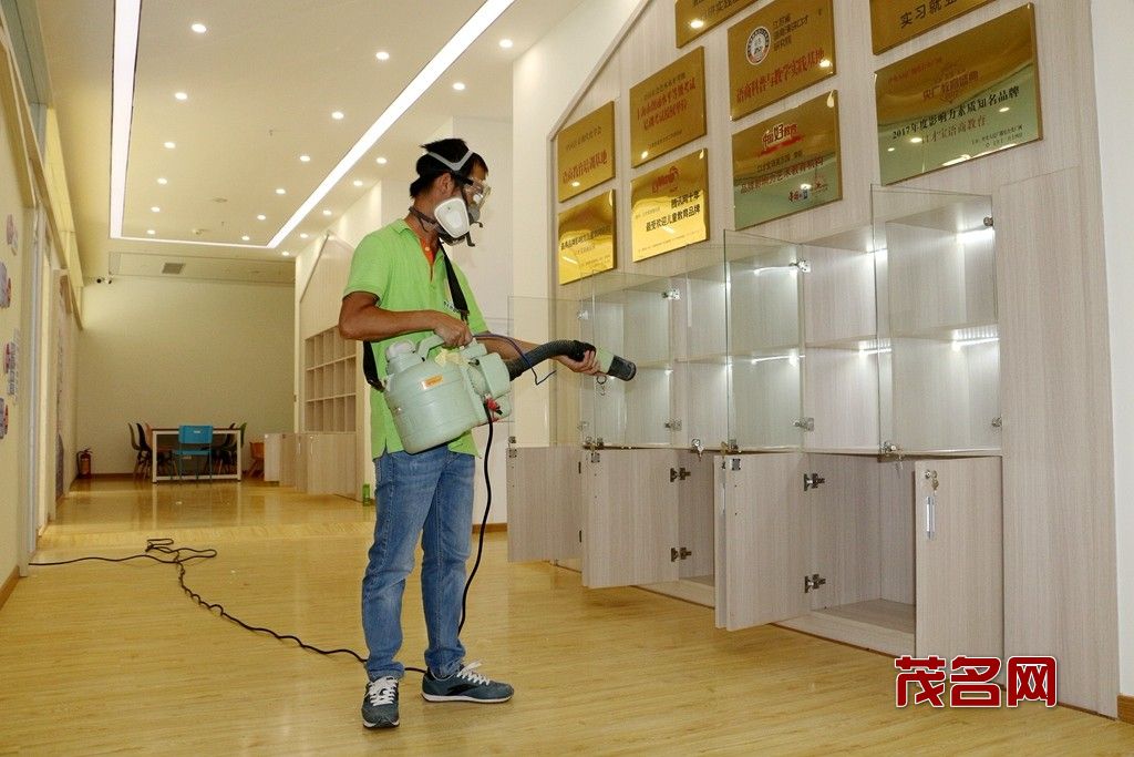 茂名市清华创富环保公司专业人员全副武装,应用目前先进的装备、技术和清除剂,针对茂名童蒙学堂的教室、教具、桌椅、走廊、画墙、天花等场所,进行地毯式除甲醛行动,将有可能危害少年儿童健康的甲醛等有害物全部清除。