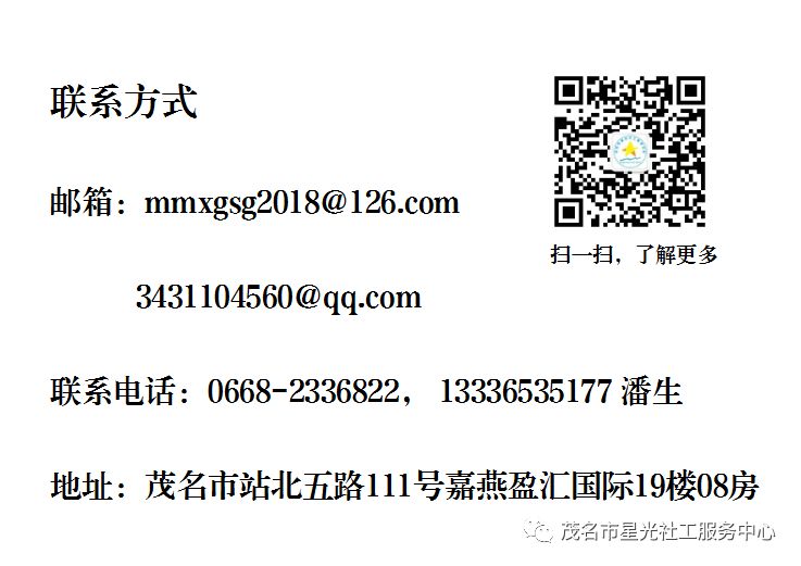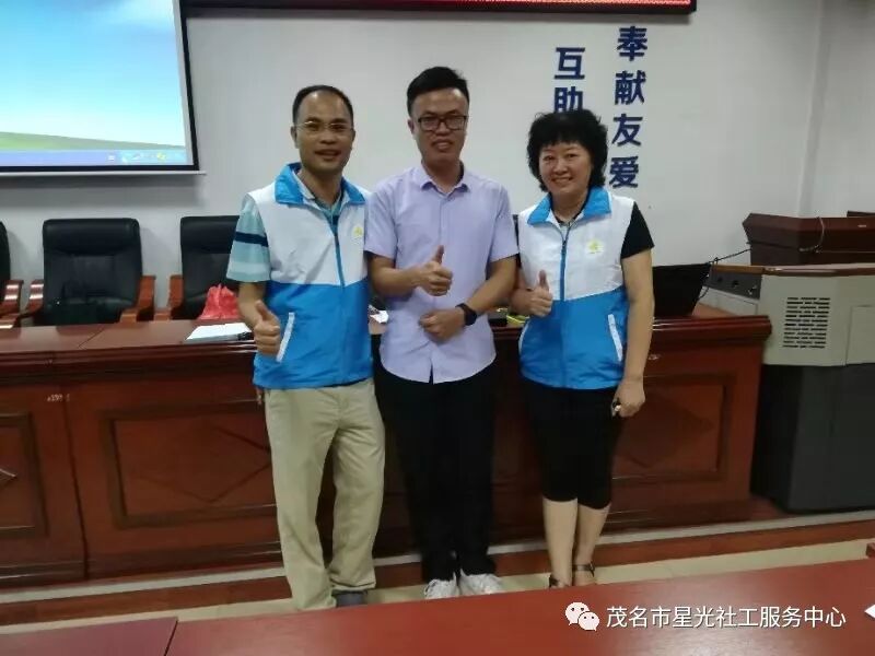 星光社工理事长潘唐广(左一),茂名市社工协会秘书长刘明波(中),周萍老师(右一)