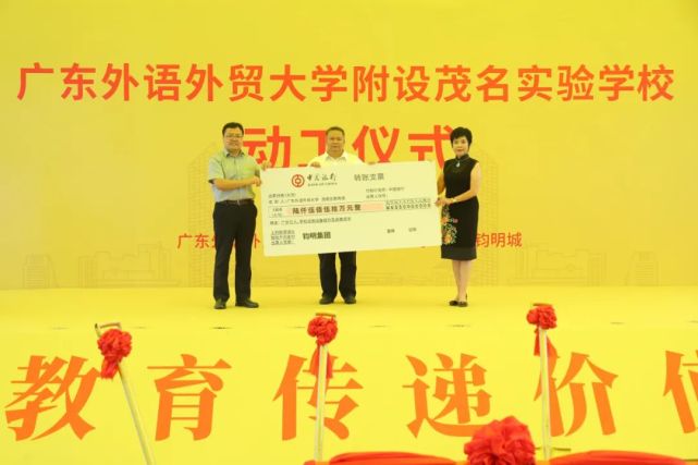 活动中,钧明集团董事、执行总裁卢亚萍女士代表钧明集团向广东外语外贸大学、茂南区教育局捐赠6550万元,以提升学校的设施设备,支持广外教育事业的发展,并设立学校的奖教奖学金,持续地支持学校教学水平和质量的提升。