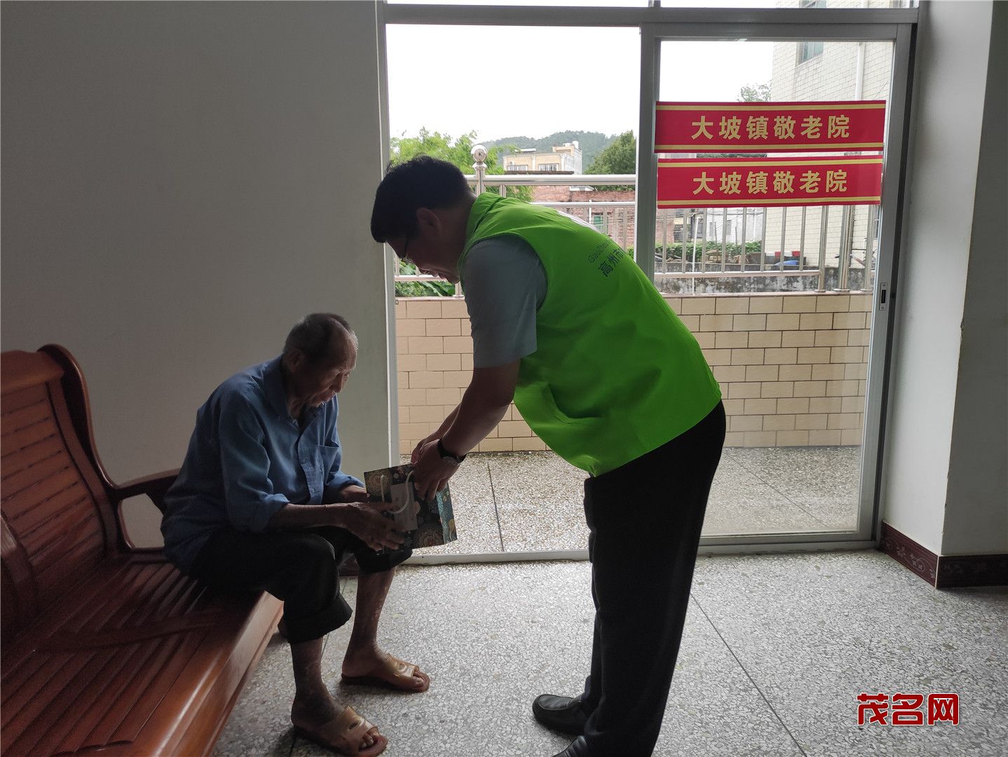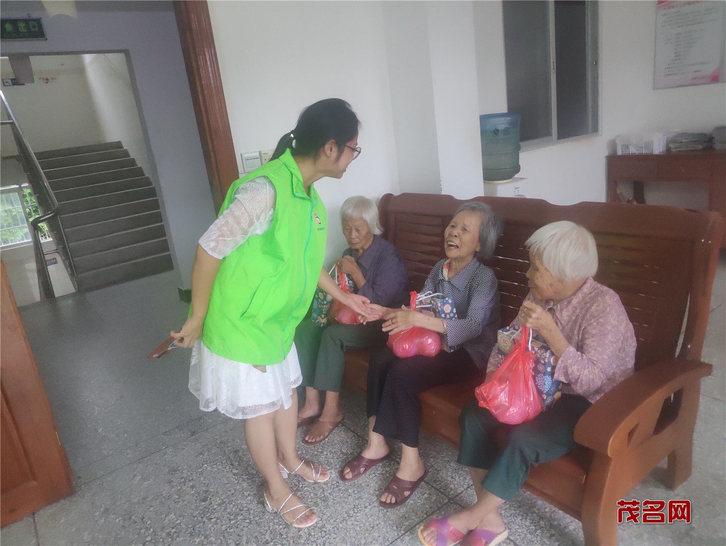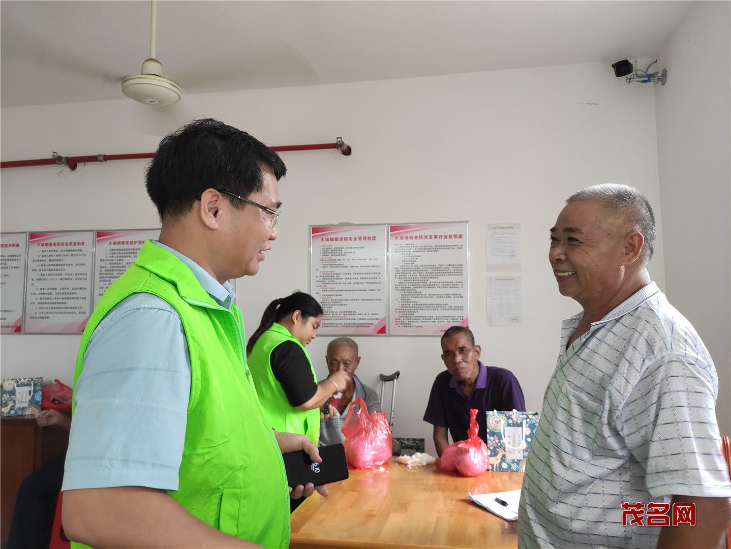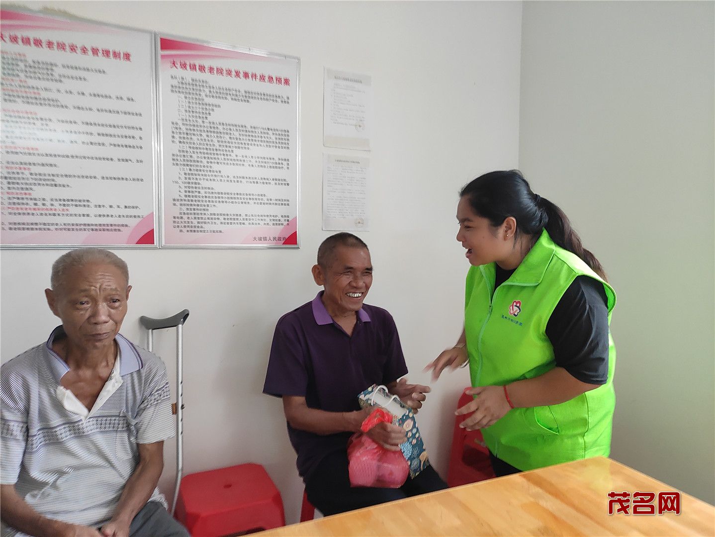 在二楼,老人们都高兴地聚集一起,志愿者有的就搬把凳子坐在老人身边陪他们聊天拉家常,了解近来的生活和身体情况;有的把带来的月饼水果分发给老人们。有的教老人们怎么使用念佛机,让他们在闲暇时候有个消遣。当志愿者得知有的老人无法下床走路,就把水果、月饼送到老人宿舍。据吴院长介绍,大坡敬老院的老人们都属于五保户,无儿无女,平时在院里看看电视,互相之间聊聊家常,有时会跟院里请假去趁趁圩。