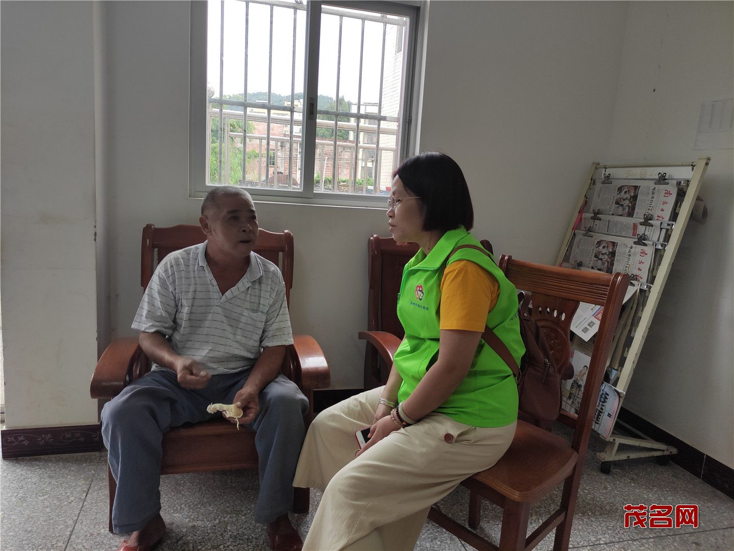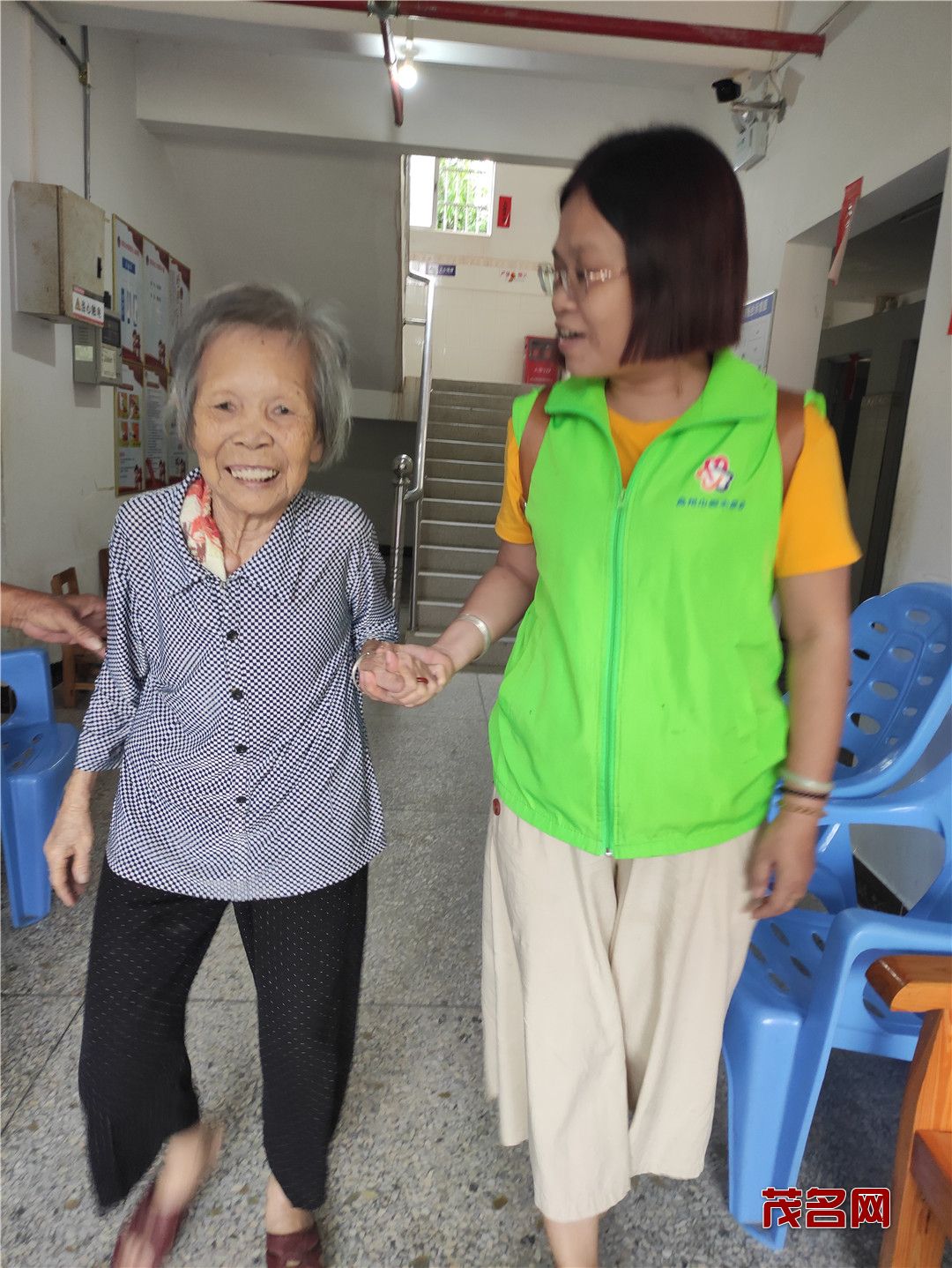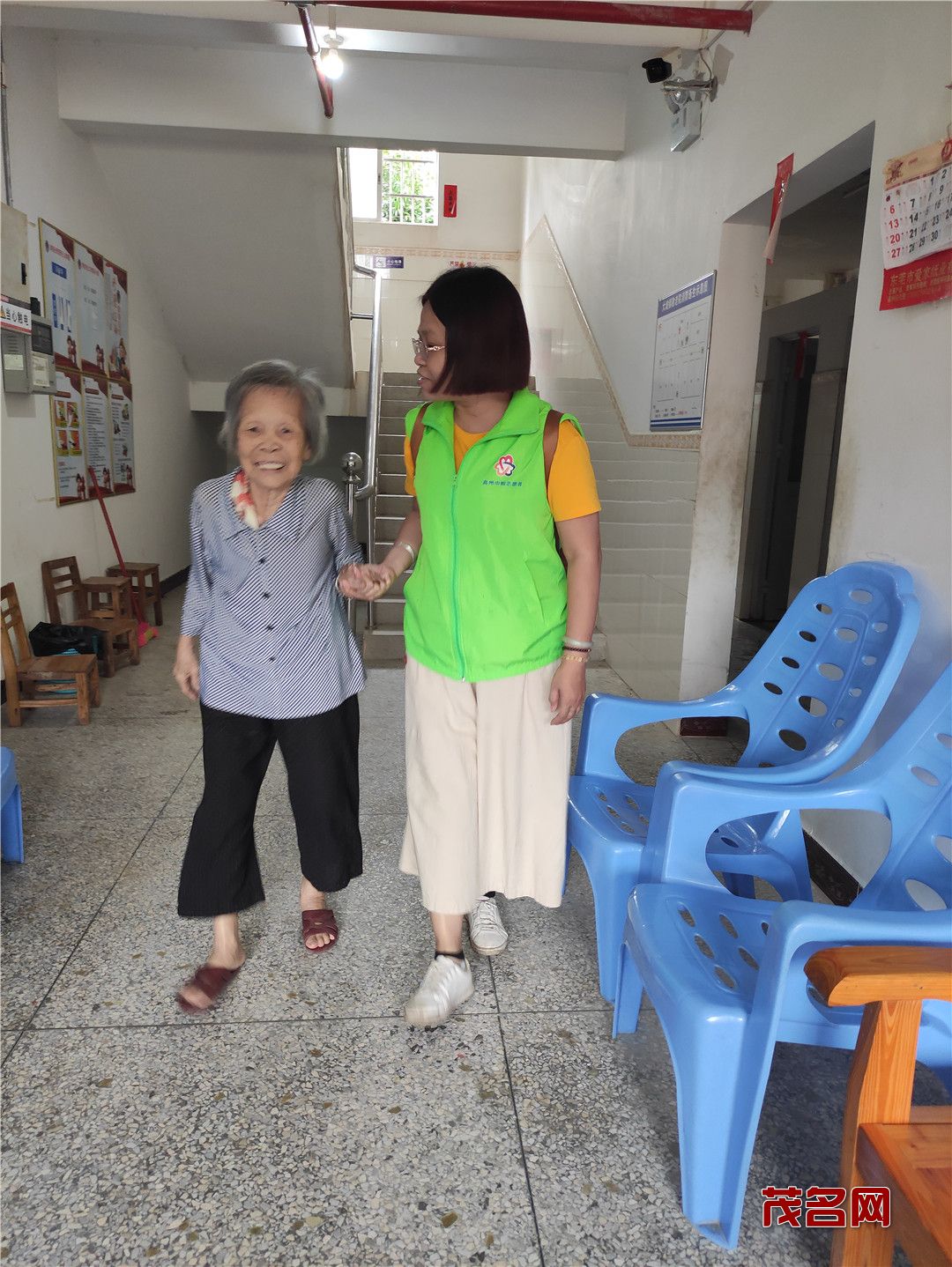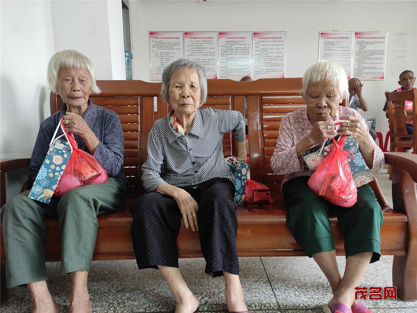 在二楼,老人们都高兴地聚集一起,志愿者有的就搬把凳子坐在老人身边陪他们聊天拉家常,了解近来的生活和身体情况;有的把带来的月饼水果分发给老人们。有的教老人们怎么使用念佛机,让他们在闲暇时候有个消遣。当志愿者得知有的老人无法下床走路,就把水果、月饼送到老人宿舍。据吴院长介绍,大坡敬老院的老人们都属于五保户,无儿无女,平时在院里看看电视,互相之间聊聊家常,有时会跟院里请假去趁趁圩。