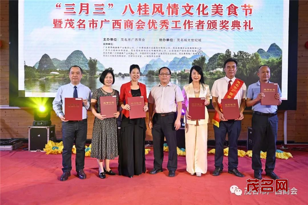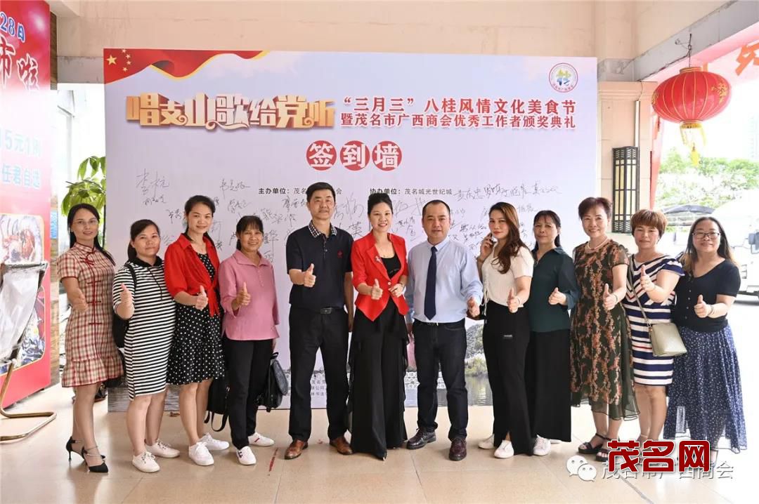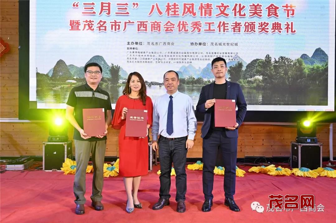 4月14日下午,由茂名市广西商会主办的“三月三”八桂风情文化美食节暨优秀工作者表彰典礼在茂名市隆重举行。茂名市政协副主席黄辉,市委统战部常务副部长龚朝文、市工商联专职副主席王宇辉,茂南区委常委崔晓玲,茂名市健康学院院长梁德萍,茂名市金融数据管理局二级调研员杨文欢,茂名市农业银行副行长钟镇冰,市非公党委专职副书记陈建文,科长梁海峰等市有关部门领导,茂名市民营企业商会党委书记会长吴土新、茂名市山西商会会长李树平,湖南商会会长费民龙,福建商会会长黄思敏以及我会会长黄秀梅、荣誉会长杨振猛、总顾问陈永良、执行会长兼秘书长邱海林、执行会长蒙李正、梁小霞、罗晓青等商会领导和广西老乡近300人参加了本次活动。
