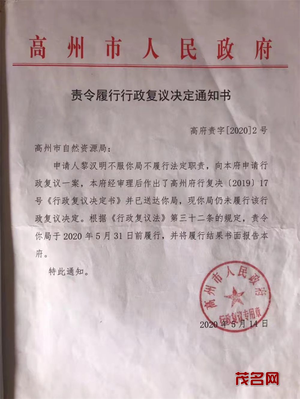 无奈之下,我又到高州市人民zhèng fǔ申请行政复议,2019年7月8日,高州市人民zhèng fǔ决定(高州府行复决(2019)17号《行政复议决定书》责令高州市自然资源局于2020年5月31日前履行组织实施拆除李凤华在非法占用土地上新建的建筑物及其他设施,恢复土地原状的法定职责。