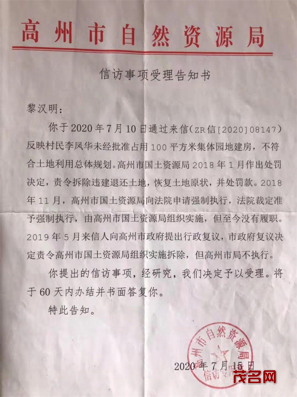 本人黎汉明是高州市曹江镇培坑村委会大坑村人,同村的李彬、李凤华夫妇从2017年九月就开始占用村中一块面积约100平方米的农用地,在没有向村建、规划、国土等部门申请审批的情况下,以李凤华之名义违法建造楼房,动工之时我就去村委、镇zhèng fǔ举报他们的违法行径,但他们毫不收敛,依然偷建抢建到二层楼房。该地块是以前村集体分下来给我家的承包耕地,具体四至为:东至水坑,南至鱼塘,西至黎焕新家,北至黎沃才家。在此过程中,我多次到曹江镇zhèng fǔ、高州市自然资源局、高州市信访局进行投拆反映。经相关部门核查,确系违法建筑。2018年1月25日,高州市国土资源局对李凤华作出行政处罚决定,一、责令李凤华限期退还非法占用的土地,拆除在非法占用土地上新建的建筑物及其他设施,恢复土地原状。二、对李凤华非法占用100平方米集体园地的违法行为处以每平方20元的罚款,共罚2000元。李凤华夫妇对此仍然无动于衷,坚决不肯拆除违建房屋,恢复土地原状。于是,高州市国土资源局于2018年11月14日向高州市人民法院申请强制执行,经法院审理裁决,准予强制执行。但是,高州市国土资源局并没有依法进行强制执行,而是将皮球踢给了曹江镇zhèng fǔ,我去找镇zhèng fǔ时,他们又把皮球踢给了高州市国土资源局。他们相互扯皮,互相推诿,就是不肯执行法院裁决。
