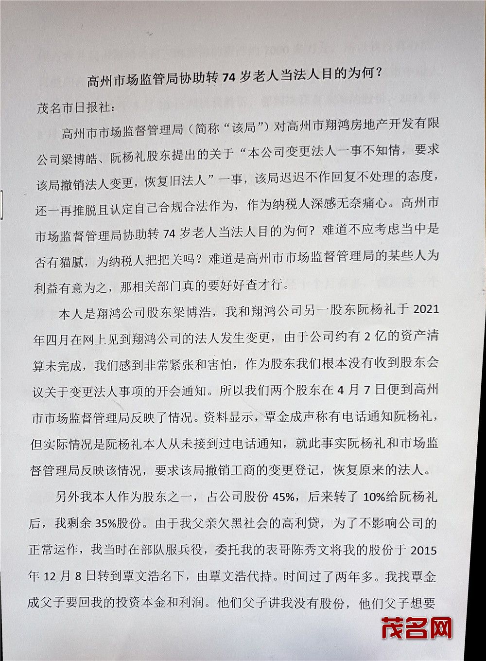 高州市市场监督管理局(简称“该局”)对高州市翔鸿房地产开发有限公司梁博皓、阮杨礼股东提出的关于“本公司变更法人一事不知情,要求该局撤销法人变更,恢复旧法人”一事,该局迟迟不作回复不处理的态度,还一再推脱且认定自己合规合法作为,作为纳税人深感无奈痛心。高州市市场监督管理局协助转74岁老人当法人目的为何? 难道不应考虑当中是否有猫腻,为纳税人把把关吗?难道是高州市市场监督管理局的某些人为利益有意为之,那相关部门真的要好好查才行。