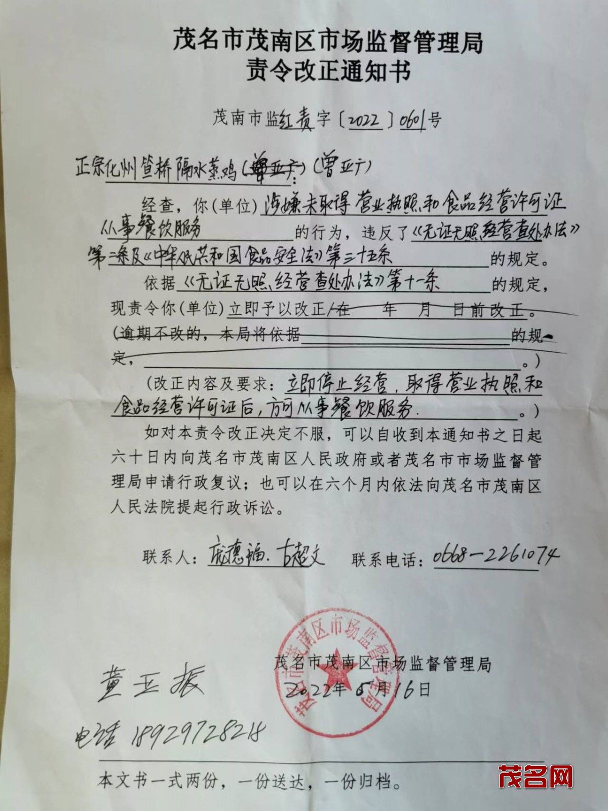 我是位于茂名市高山路与茂化快线北向的鸡年年餐饮店法人代表曾亚广。今年四月份,我与董亚振合伙租了茂名市高山路与茂化快线东延线北向的铁皮屋经营鸡年年餐饮店,出租屋主是黎爱宇。我在餐饮行业做了好多年,最擅长制作化州美食隔水蒸鸡,很多食客慕名而来品尝。没想到祸不单行,因开店时间仓促,营业执照和食品经营许可证还未审批下来,茂南市场监管局于6月16日开具了责令改正通知书,要求立即停止经营,取得相关证件后方可开店。