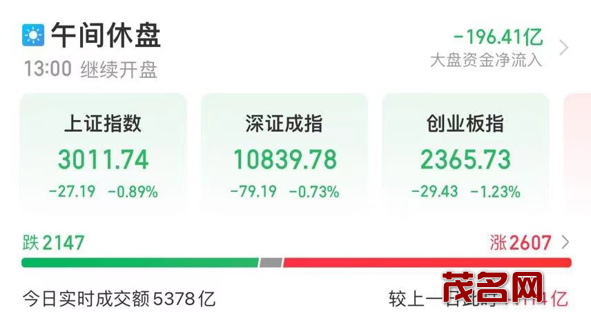 三大指数早盘冲高回落,午间休盘,沪指跌0.89%,深成指跌0.73%,创业板指跌1.23%。沪深两市半日成交额5378亿元。