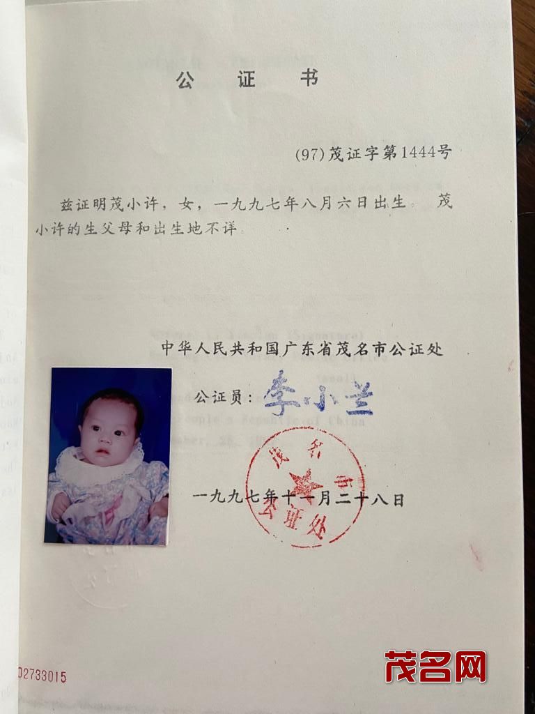 茂小许,是茂名市社会福利院给她取的名字。以城市名的第一个字为姓,福利院希望她能记得自己的根在茂名市,在中国南方的广东省。小许自己也一直记得自己来自哪里。