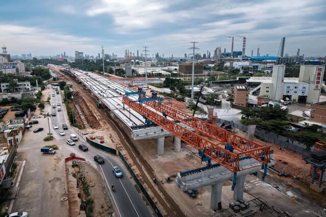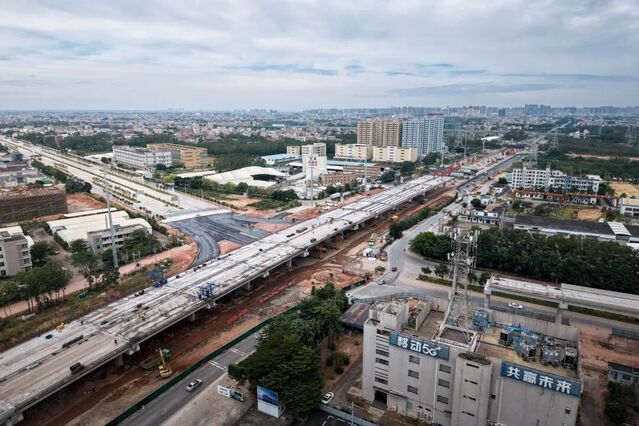 一期工程两大核心节点正同步迎来施工攻坚,茂南大道立交全力推进桥梁下构施工,市民大道立交则重点突破跨百越大道钢混组合梁架设。