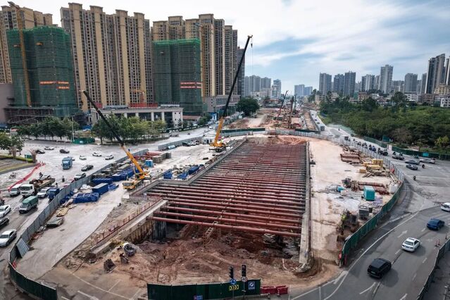 三期下穿隧道深处,基坑开挖与支护工程协同推进,主体结构施工取得关键突破。
