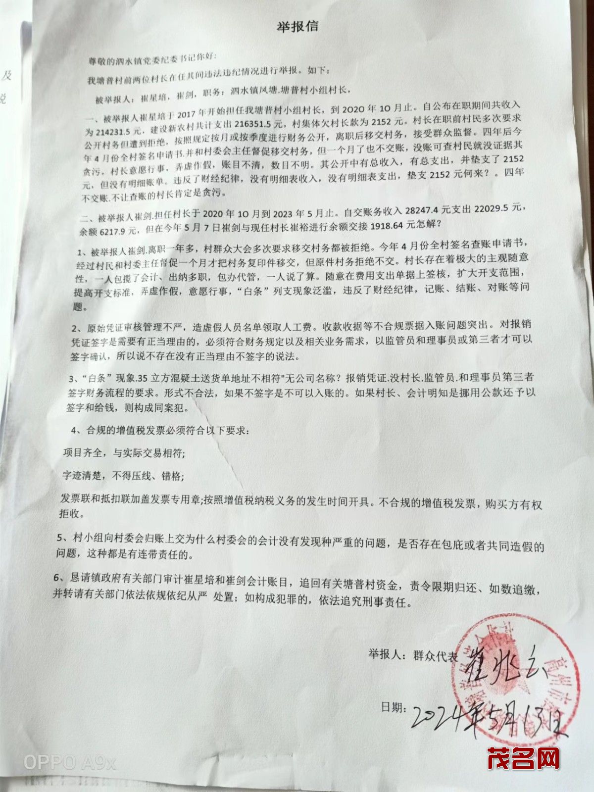 6、恳请有关部门审计崔星培和崔剑会计账目,追回有关塘普村资金,责令限期归还、如数追缴,并转请有关部门依法依规依纪从严 处置;如构成犯罪的,依法追究刑事责任。 举报人:群众代表崔兆云 日期:2024年5月13日