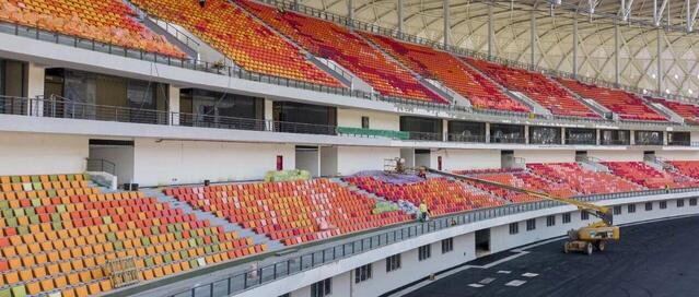记者在现场看到,数名头戴安全帽的施工人员在高空作业平台上默契配合,将一排排崭新座椅的构件精准定位、拧紧固定。已安装完成的部分区域,座椅线条流畅,呈现出整齐划一的视觉效果。据悉,这些座椅主要采用耐用、舒适的材料,颜色设计上可能融入海洋或荔枝等地方元素,与场馆整体“海浪拍岸,荔香飞扬”的设计理念相呼应。