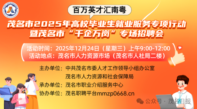 为充分发挥人力资源社会保障部门保企业用工、稳就业形势作用,助力茂名市用工企业招才引智,促进高校毕业生等重点就业群体高质量充分就业。中共茂名市委人才工作领导小组办公室、茂名市人力资源和社会保障局定于2025年12月24日上午9:00-12:00在茂名市人力资源市场联合举办“百万英才汇南粤”茂名市2025年高校毕业生就业服务专项行动暨茂名市“千企万岗”专场招聘会,欢迎各用人单位踊跃报名参会。