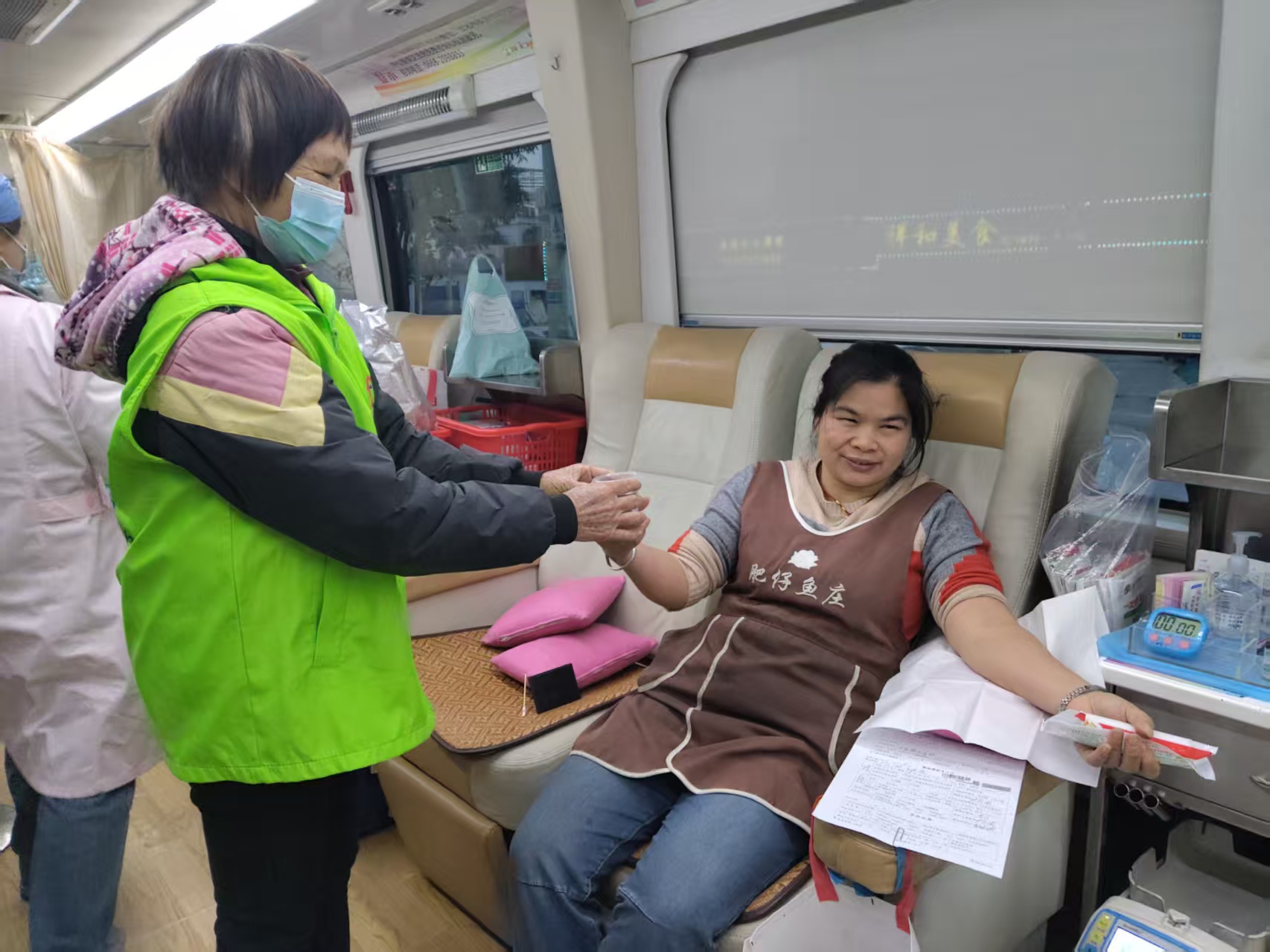 活动现场,志愿者们分工明确、有条不紊。有的顶着寒风在广场入口引导市民,耐心讲解冬季献血的注意事项与健康常识,打消大家对低温献血的顾虑;有的在登记区协助填写表格、核对信息,细致询问献血者近期健康状况,确保每一项流程都严谨规范;有的则在采血区旁随时待命,为献血者递上温热的糖水与面包,用贴心问候缓解他们的紧张情绪,提醒献血后按压针眼的正确方法 。绿色马甲的身影在寒风中来回穿梭,他们搓着冻红的双手,却始终面带微笑,用忙碌的身影驱散着冬日的严寒。