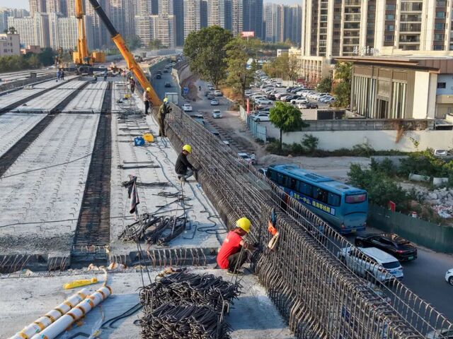 据了解,针对茂南大道、市民大道两个立交节点的进度差异,该项目部核心采取“同步攻坚、资源共享、同步冲刺”的推进策略,通过工序精准拆分、班组高效调配、节点严格管控,迅速缩短进度差异。针对桥面湿接缝、防撞护栏浇筑、桥面防水铺装等耗时较长、技术要求高的工序,两个立交同步组建专项施工班组,采用“多班组平行施工+24小时两班倒+应急班组待命”的突击模式推进。