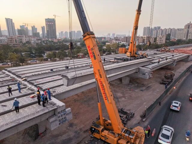 19日傍晚6时许,暮色渐浓的施工现场,两台大型吊机同步舒展钢铁吊臂,粗壮的钢索稳稳扣住箱梁两端,在信号工指挥员精准的指令下,缓缓发力将103吨重的箱梁平稳升空。梁体在空中缓慢平移,在信号工、司索工默契配合协同作业下,最终实现箱梁精准落位。“随着茂南大道立交最后一榀箱梁吊装完成,快速化改造一期工程已顺利实现主线桥梁结构贯通,比原计划提前12天。