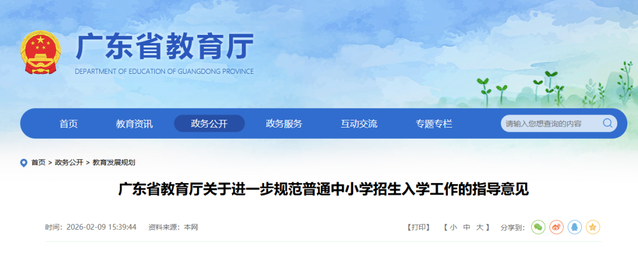 广东省教育厅近日发布最新版《关于进一步规范普通中小学招生入学工作的指导意见》,于2026年3月10日起正式实施,有效期5年。