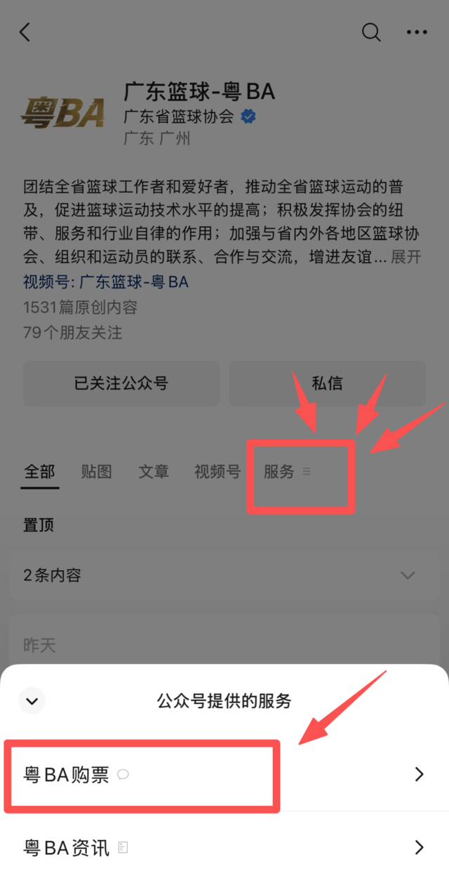 1.在“广东篮球-粤BA”微信公众号,点击菜单栏的“服务”,点击“粤BA购票”进入购票系统。