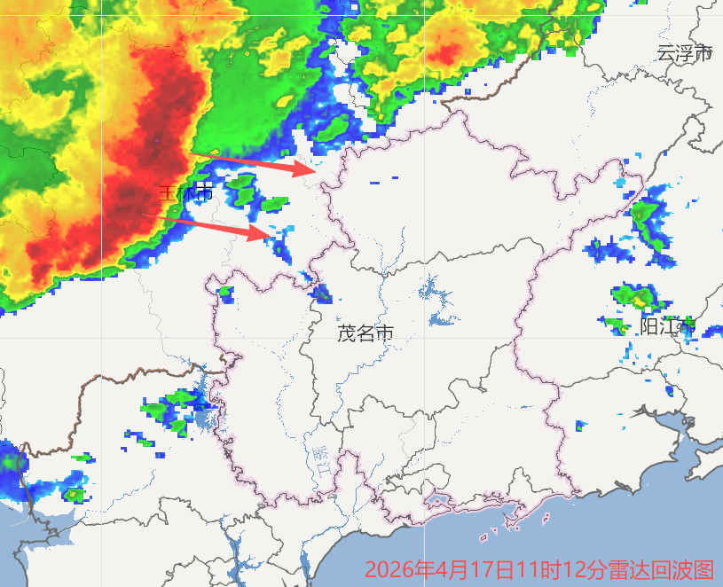 【茂名强对流天气提醒】目前广西有强对流云团发展并向偏东移动,受其影响,预计未来6小时我市大部地区将有雷雨,局地伴有短时大风和短时强降水等强对流天气,茂名市气象台2026年04月17日11时22分发布强对流天气警报,请注意防御。