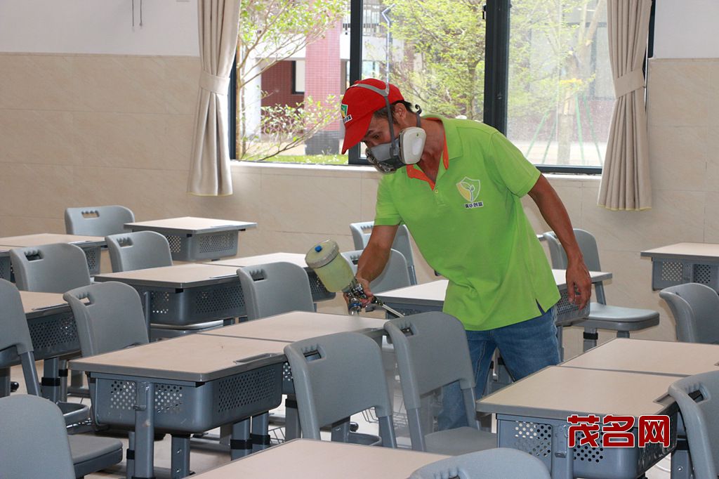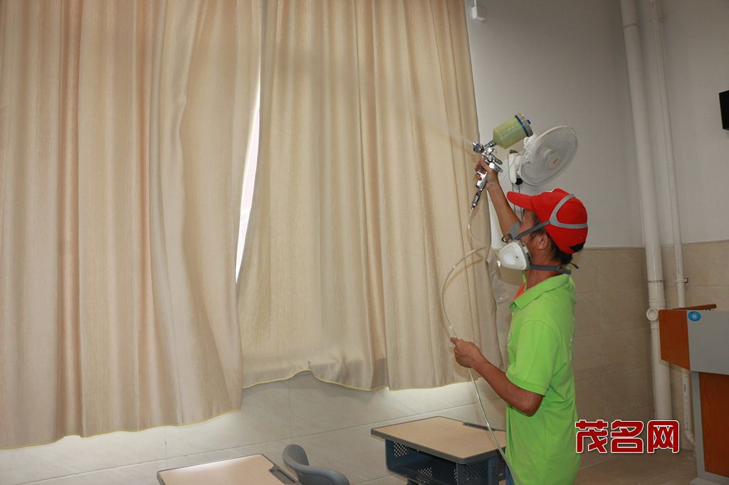 茂名清华创富环保施工人员对小学所有墙面、顶面、地面、桌椅、箱柜等进行喷涂,确保每个角落都不遗漏,为学生和老师创造良好的学习和工作环境!