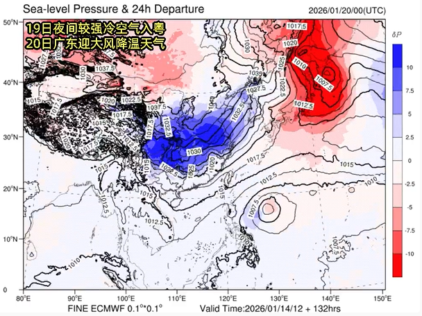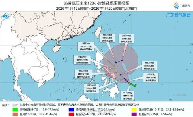 菲律宾以东的热带低压可能于今天(1月15日)加强为今年第1号台风“洛鞍”,最强可达热带风暴级或强热带风暴级(9到11级)。该热带低压将往偏西北方向移动,下周初受冷空气带来的东北季风影响,可能在菲律宾以东洋面徘徊,对广东省海面无直接影响。